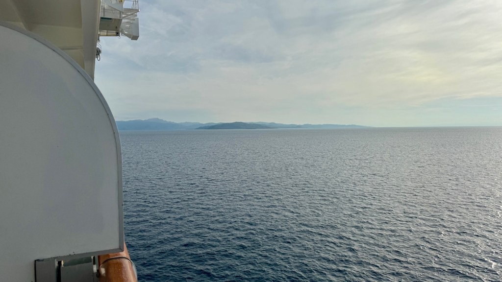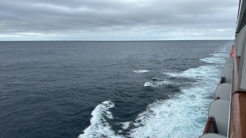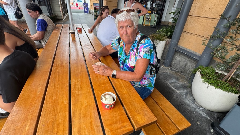 Our ship departed around 6:00pm through the Great Barrier Reef and into some moderate seas with a few bumps thrown in. With my walking poles, I have an ‘all clear’ passage as other folk “get out of my way”. Yes, if you see someone coming with walking aids, you make a swift move to the left or right of the walkway, especially in the lido dining room. The next day is a sea day and we find a quiet spot in the library to play 5 crowns and enjoy what the barista does for us.