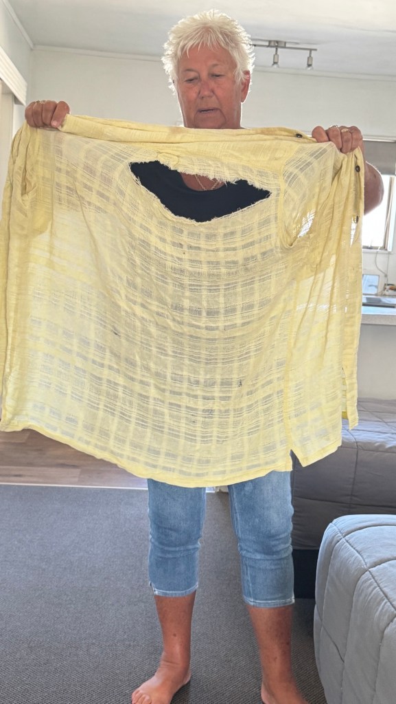 Driving into town to refill our gas bottles, we found this exhibition of women’s bras on the fence of the local radio station broadcasting location. Must have had a fund raiser for breast cancer at some point.