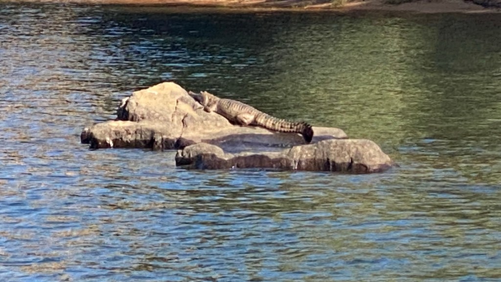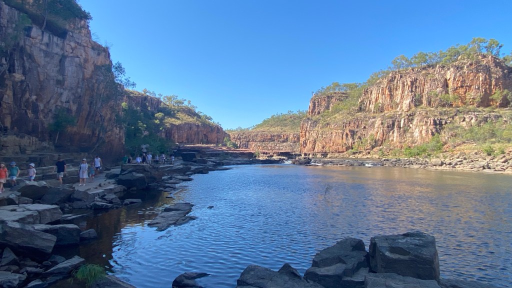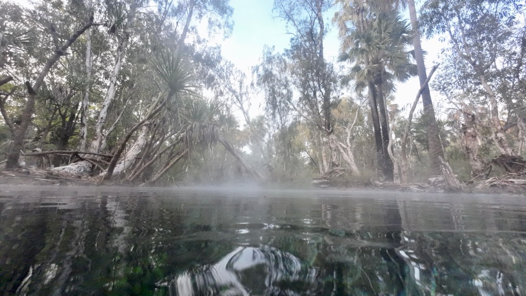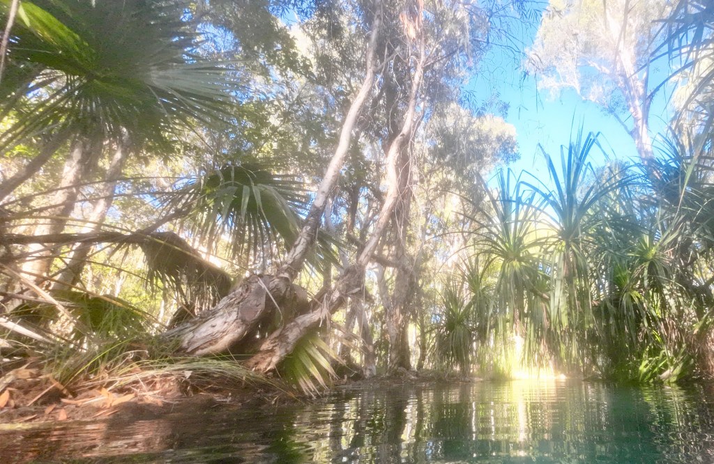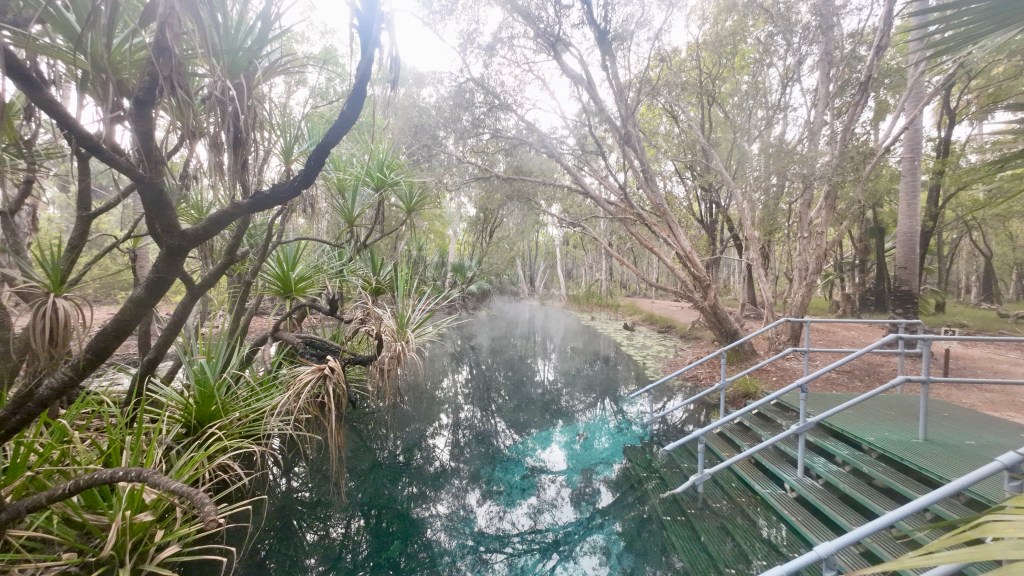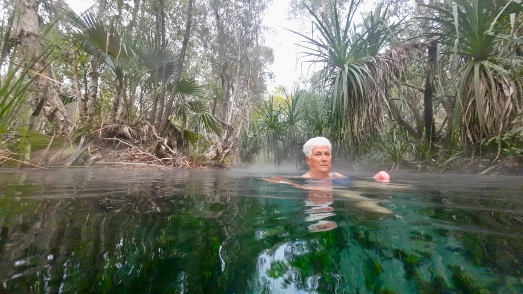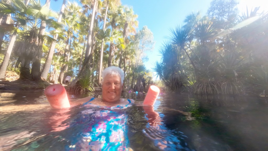 On just another 70 km once we woke, to Bitter Springs. Originally, the plan was for two nights but our stay has been extended to four nights. Close by the caravan park are some hot springs which no one seems to know where they start and to where the water ends up. However, tourists passing through the town often use the springs for a “freshen up” mid-journey. Things can get busy with this popular spot.
