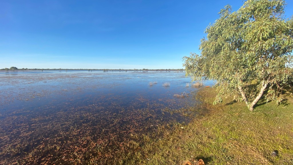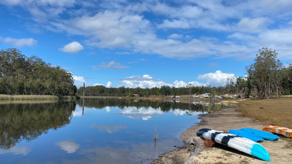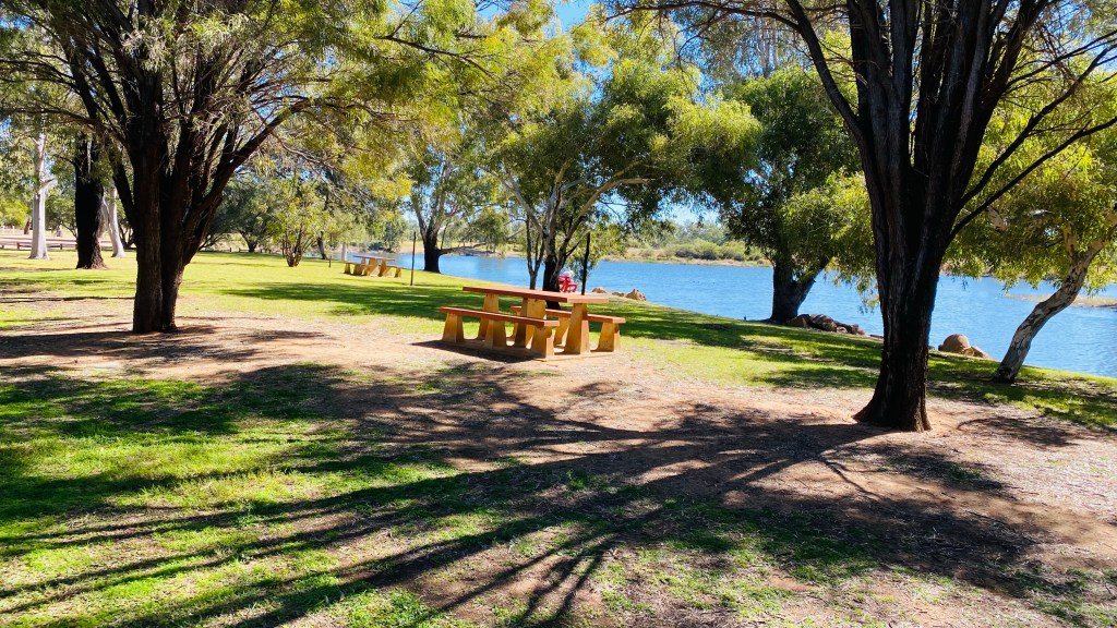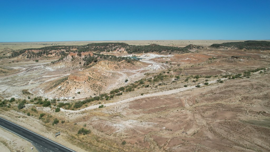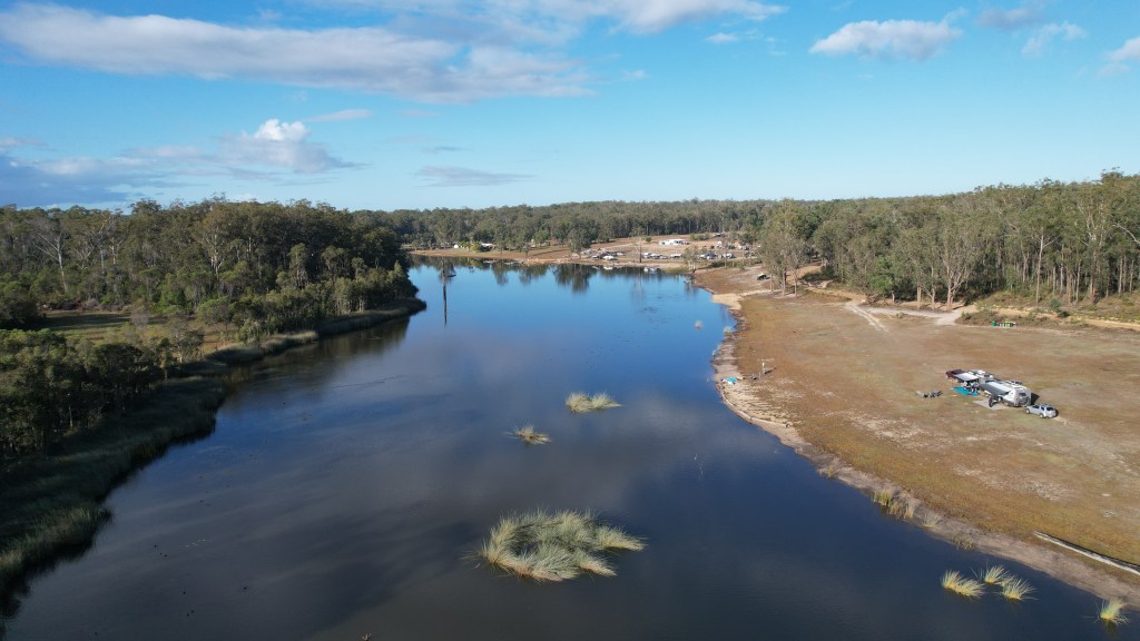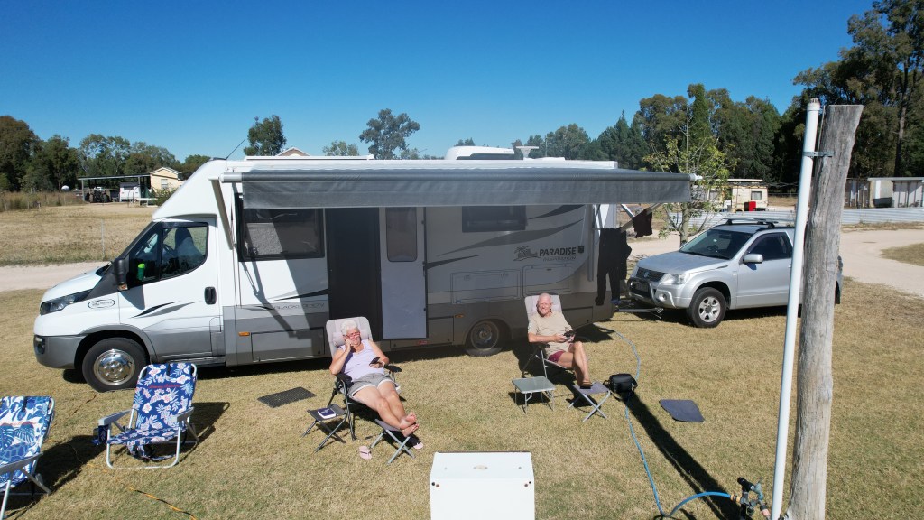 We came across a rest stop that looked like it had grass around. After venturing in towards a large water mass, we found a spot to free camp for the night. Frewena Rest area proved to be satisfactory and, unbeknown to us, the guy next to us is an ex Army signals specialist and had a Starlink attached to his caravan. He knew “everything” about it and we’ve been convinced to purchase the hardware. Apparently, a new aerial is now being shipped designed to sit on top of caravans and motorhomes. Once fitted, Lyn should have almost perfect internet to do her travel agency work anywhere we are, even while moving. Back to the location; the drone had a workout again.