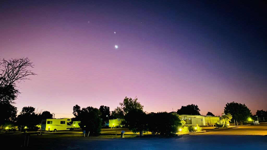 The next night, we thought of staying at a WW2 airstrip free camp. As we turned into a red dusty driveway, we saw a heavy looking gate ahead, and decided to walk to the gate to check it out. “No, we won’t stay there.” Our decision made, but we had to reverse out the motor home with car in tow. When you reverse, the wheels of the Suzuki turn suddenly and you have to drive forward to correct the steering and then try reversing again. (Yes, we thought of the idea of having Lyn hop in the Suzuki and steer – someone had to guide me back onto the highway). Finally, we were on our way again with the sun starting to set. We made it to another free highway spot at Warlock Rest area some 40km south of Mataranka. The noise of road trains all through the night interrupted our sleep regularly.