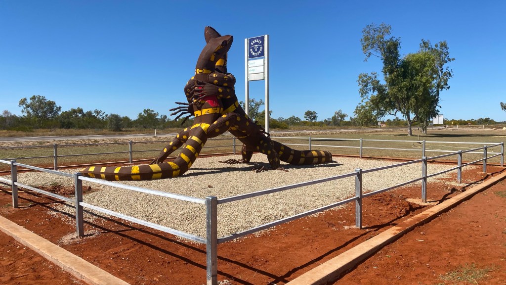 The experience of staying at Banka Banka Tourist Camp is worth it, just to see how these places work. Tourists only drop in for a night’s stay and then off in the morning heading either north to Darwin or south towards Tennant Creek. We met up with a couple we had met at our nieces wedding about 25 years ago. (We must look pretty young – they recognised us.) Once the caravans have vacated their sites, the owners turn on the water sprinklers to try and get the grass soft and “like home” before the next occupants arrive within a few hours. We had a hold up in the morning trying to get the Suzuki transmission set properly for free wheeling behind the motor home. Eventually set off north again.