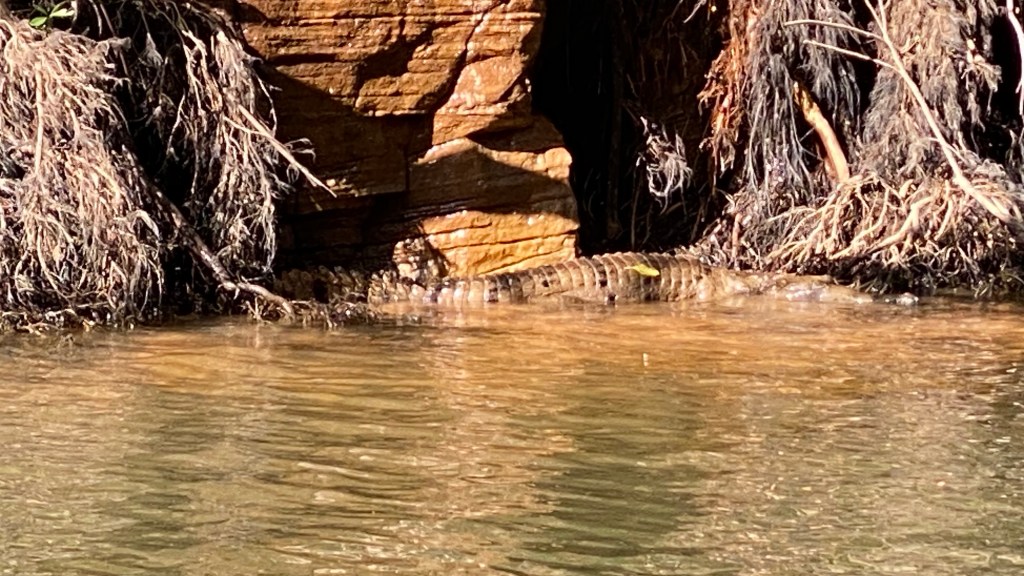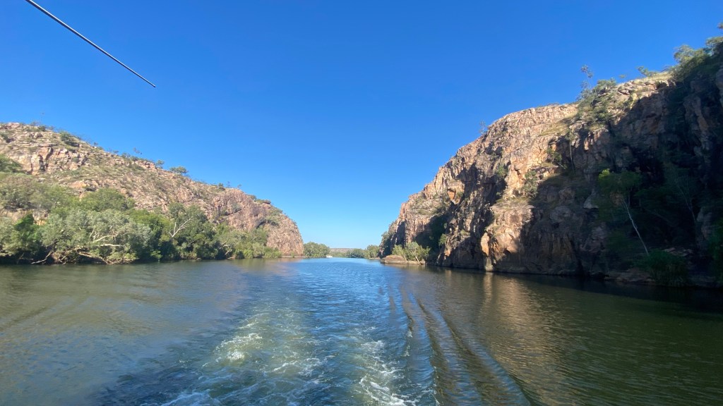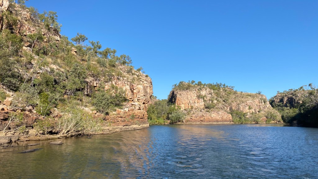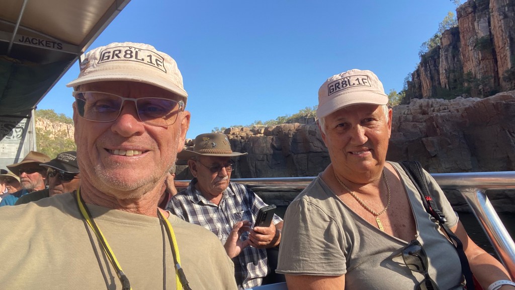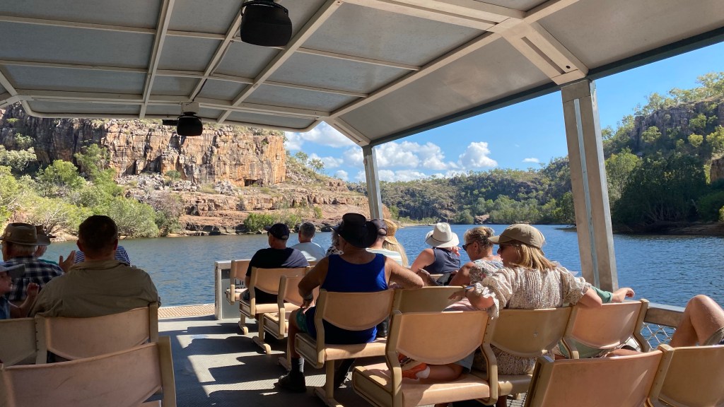 The tourist information office in Katherine convinced us to do a 2 hour cruise in the Katherine Gorge at 9:00am in the morning. We must have some “drawing power” from the heavens as blue skies and sunshine turned up for the length of the journey. The guide and pilot of the flat bottomed boat, did a great job, without any notes, quoting millions of years at every moment he thought we needed convincing of the span of time. It seemed he was around the place back then. The rock painters had a great time too, mixing clay and stone and excretions from leaves to create interesting wall story paintings of yesteryear.