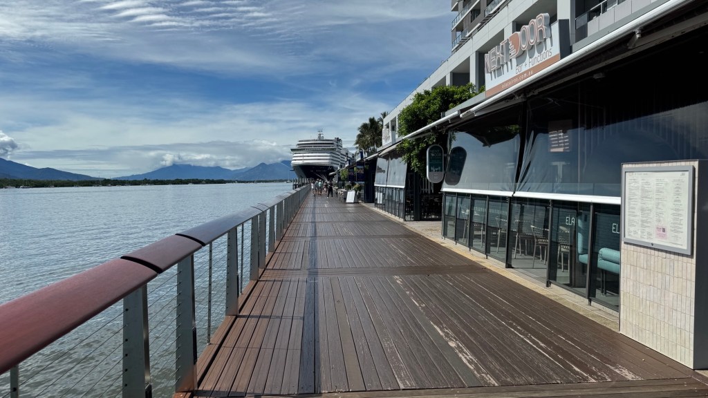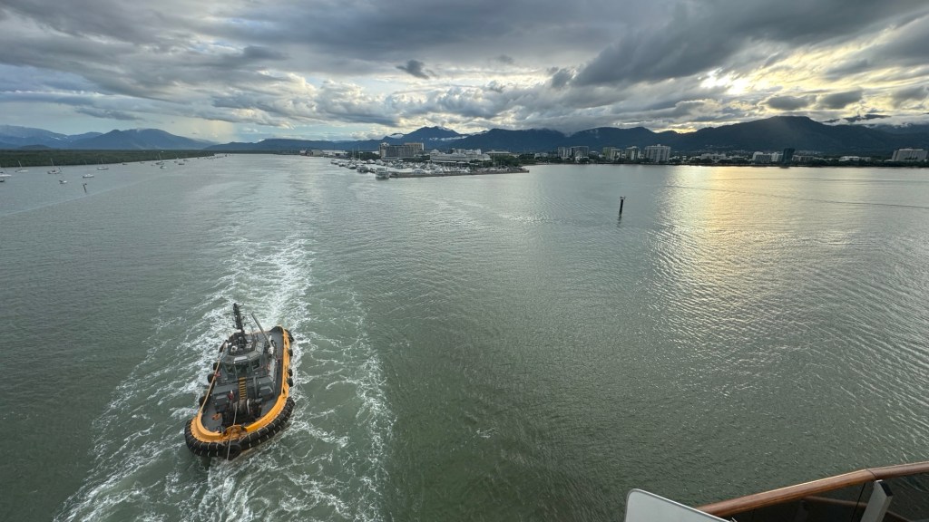 Due to an evolving tropical cyclone, our entry into Cairns was delayed until 6pm. The seas were calm but the harbour master wouldn’t allow large ships to berth until the exact direction of the cyclone was known. It made landfall about 400 km to the south of us.