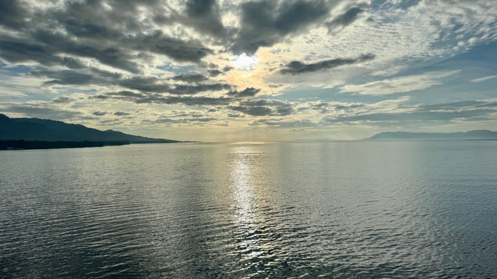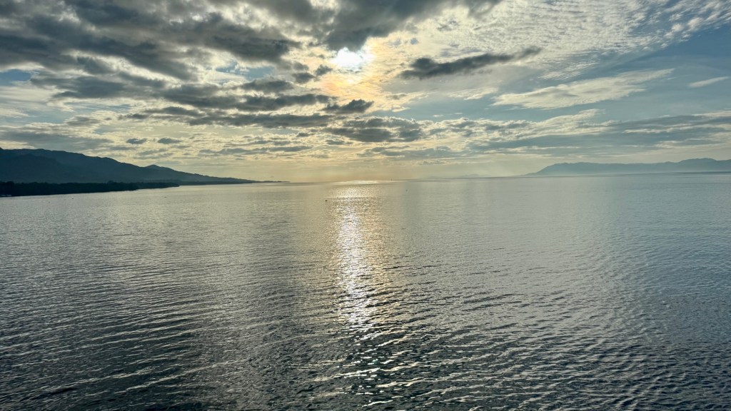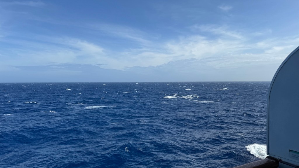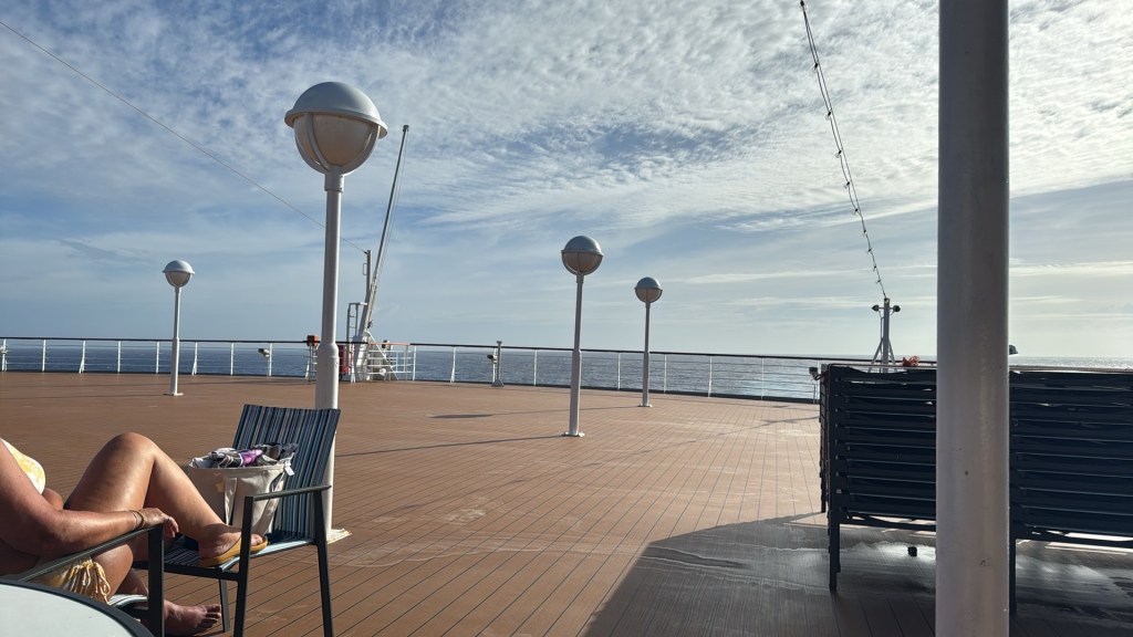 Our ship departed around 6:00pm through the Great Barrier Reef and into some moderate seas with a few bumps thrown in. With my walking poles, I have an ‘all clear’ passage as other folk “get out of my way”. Yes, if you see someone coming with walking aids, you make a swift move to the left or right of the walkway, especially in the lido dining room. The next day is a sea day and we find a quiet spot in the library to play 5 crowns and enjoy what the barista does for us.