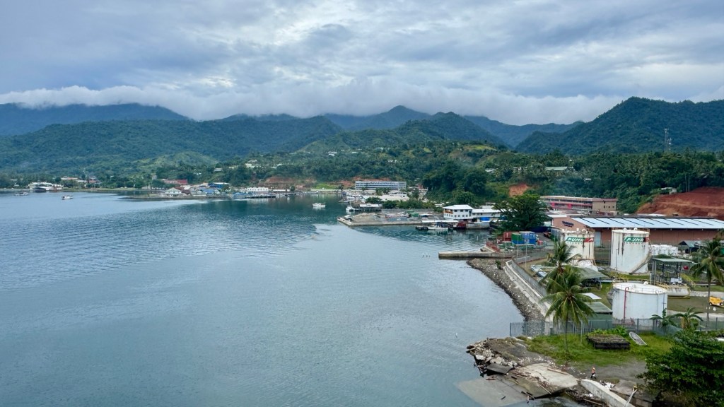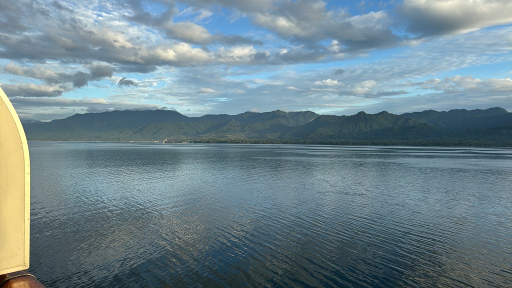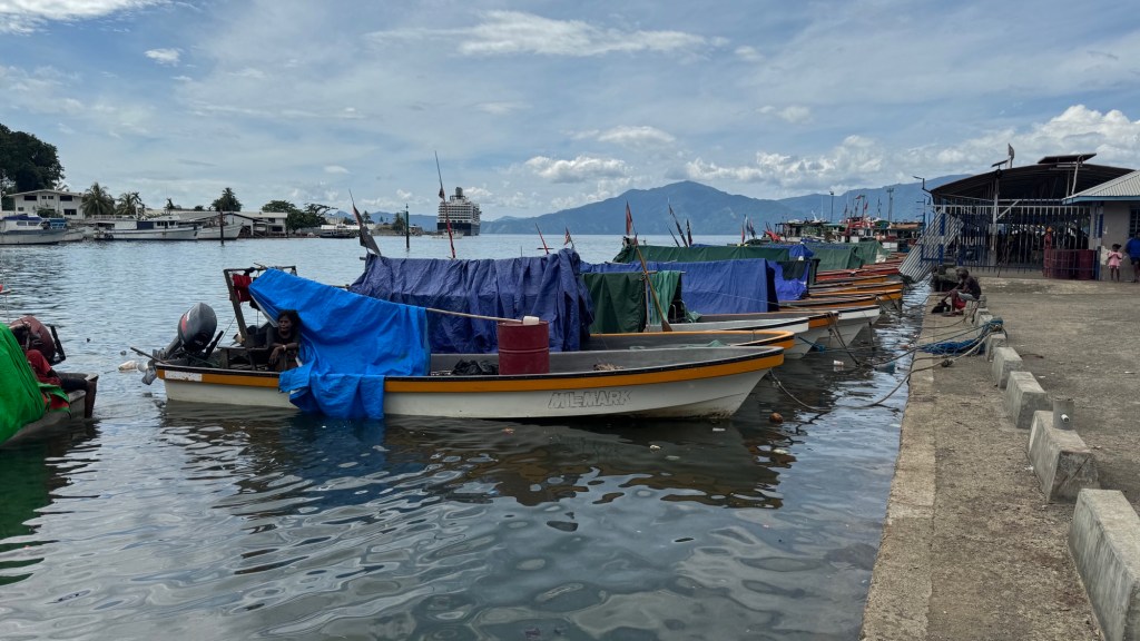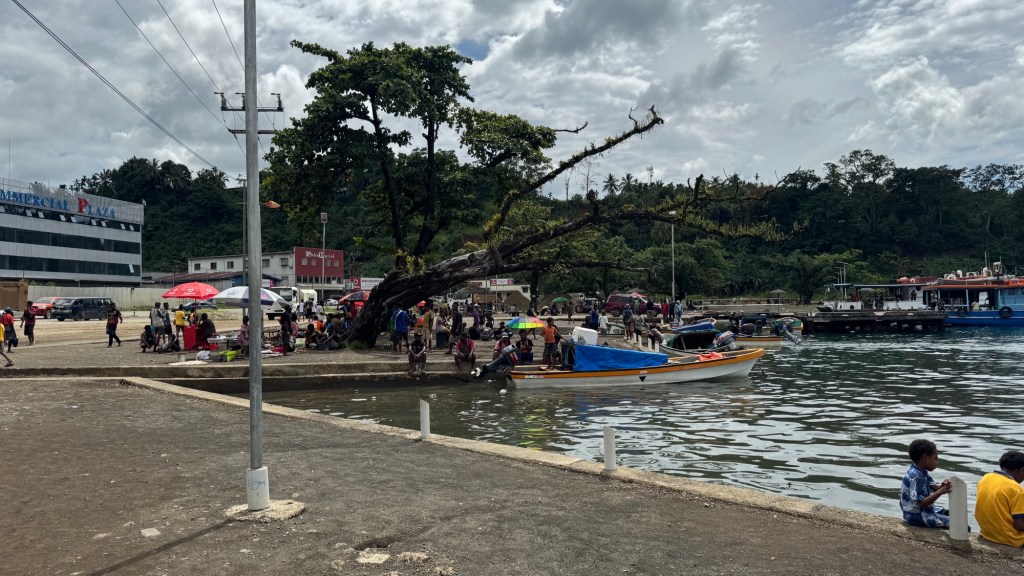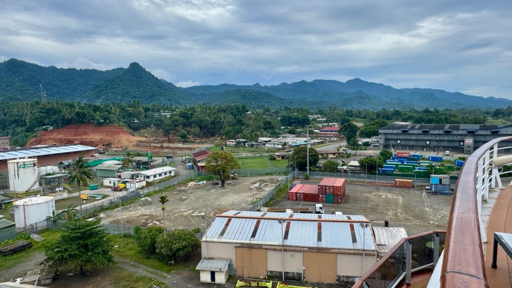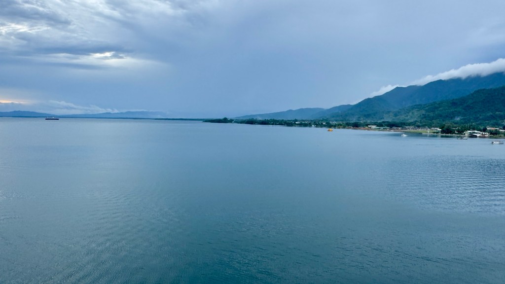 During each woken moment during the night, I check Google Maps to see our location at that point. It was noticeable when we came through the reef into the lagoon near Conflict Islands; the bouncy rocking ceased. We were back in Papua New Guinea after 40 years absent. I had never been to Milne Bay Province when we lived in PNG in the early 80s, but it’s a very nice harbour and a very busy little town. Not sure why there’s no resort here but it would be a great spot.