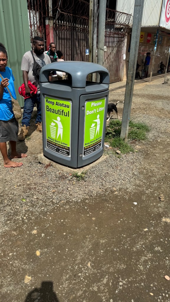 The streets are typical PNG style. Lots of broken pavements and rubbish. Noticeable are the “keep Alotau Clean bins” and the list of fines for chewing or spitting betelnut.