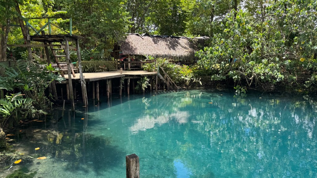 In Vanuatu, blue holes are deep freshwater ponds formed where underground springs rise through limestone rock to the surface. The clear, pure water absorbs longer light wavelengths, making the holes appear vividly blue — almost unreal in colour. Many are surrounded by jungle and accessed via paddling up rivers or through forest tracks.