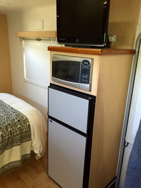 The TV, micro wave, fridge units