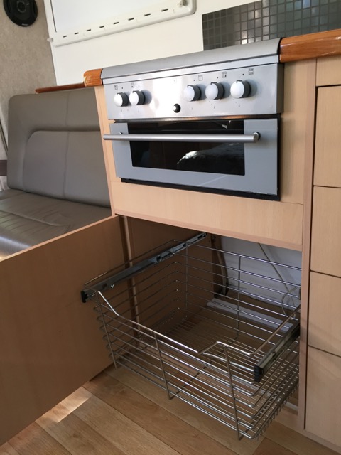 Wire storage bin under stove